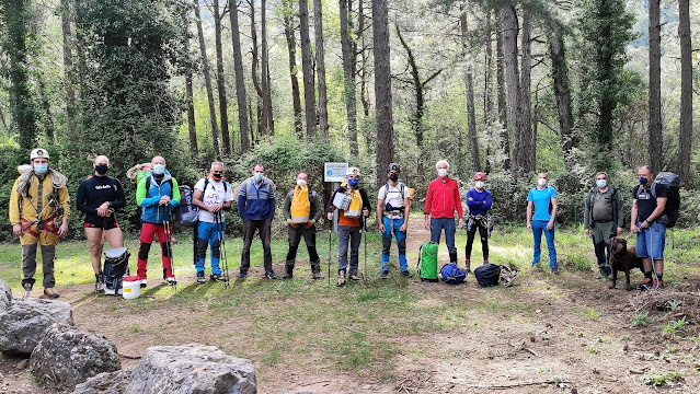 De izquierda a derecha - Gerardo García Sánchez... (de Riopar) del G.I.S. de Cartagena - José Martín Sotos Martín, bombero de Montaña Activa , Albacete - Oscar García Gallego, bombero, Montaña Activa de Albacete - Antonio Cid Dorribo, médico del grupo de socorro de Albacete - José Manuel, Agente Medio Ambiente - Ginés,  Agente de medio ambiente - José María Calaforra , Universidad de Almería - Carlos Vicente Galindo, de Montaña Activa de Albacete - Antonio González  Grupo Velezanos - Salvador Luque, Mérida, Bombero del Grupo Speos de Alcoy - Antonio Catalán, (director del Parque Natural) - Pepe Pozo, jefe de Agentes de Medio Ambiente de la zona - Mavil Marín Palop, del Grupo Speos de Alcoy - FOTO: Inma Ayuso